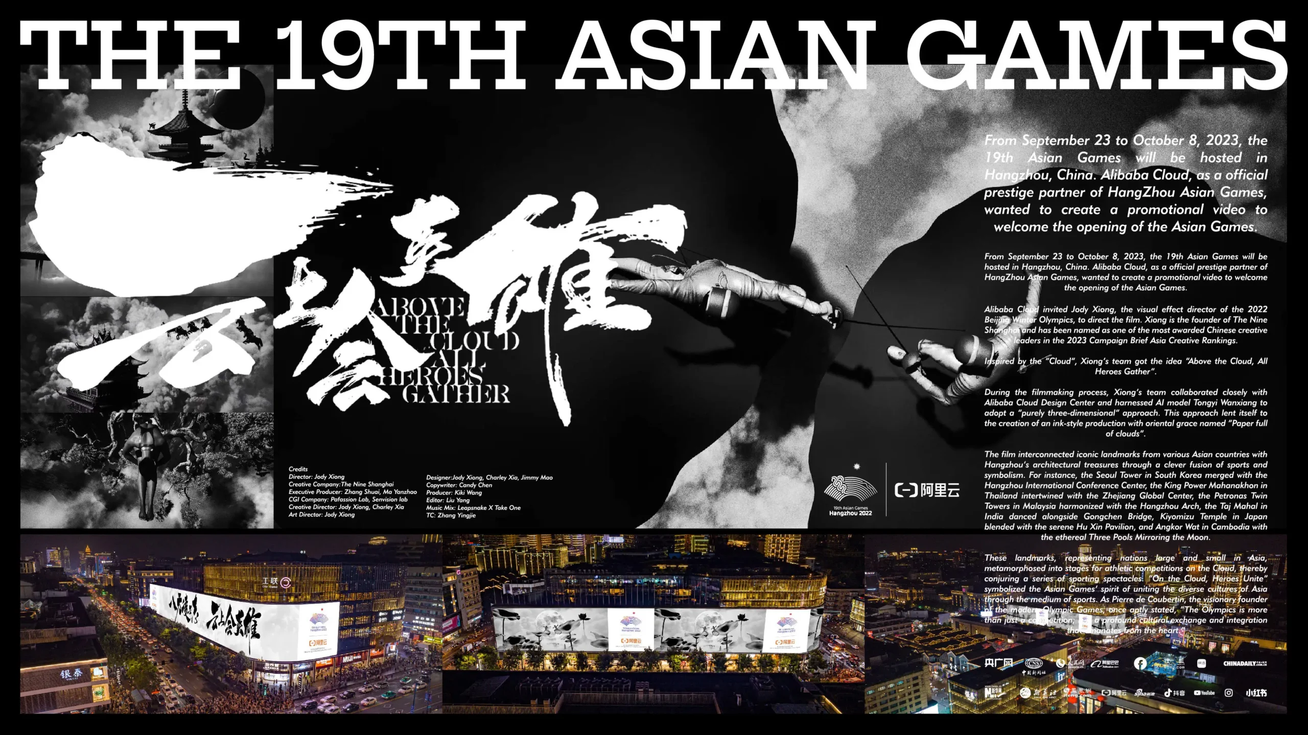 The design concept of ” Above The Cloud, All Heroes Gather” is deeply inspired by the artistic conception of “clouds and mist swirling, presenting a myriad of meteorological wonders” from classical Chinese poetry. It aims to showcase the magnificent scene of athletes from various Asian countries gathering for this grand event through the form of visual art. The short film takes “smoke” and “cloud” as its visual axis, cleverly utilizing Alibaba’s AI large model and 3D design software to combine the smoky style of ink painting with modern landmark buildings, creating a visual experience that is both classical and avant-garde. As the ancients said, “Clouds and mist are the spiritual essence of heaven and earth, ever-changing and manifesting in myriad forms.” In the short film, the clouds and mist are not just visual elements; they also carry the mission of connecting Asian cultures and conveying the spirit of the Asian Games.In the composition of the short film, landmark buildings from various Asian countries such as the Petronas Twin Towers in Malaysia, Kiyomizu-dera in Japan, and the Taj Mahal in India, intertwine with iconic buildings in Hangzhou such as the Hangzhou Gate, Mid-Lake Pavilion, and Gongchen Bridge under the shroud of clouds and mist, creating the illusion of being immersed in a surreal landscape painting. These landmark buildings, enveloped in swirling clouds and mist, transform into stages for athletes to compete, showcasing the diversity of Asian cultures while embodying the vision of the Asian Games spirit that closely connects people from all nations.