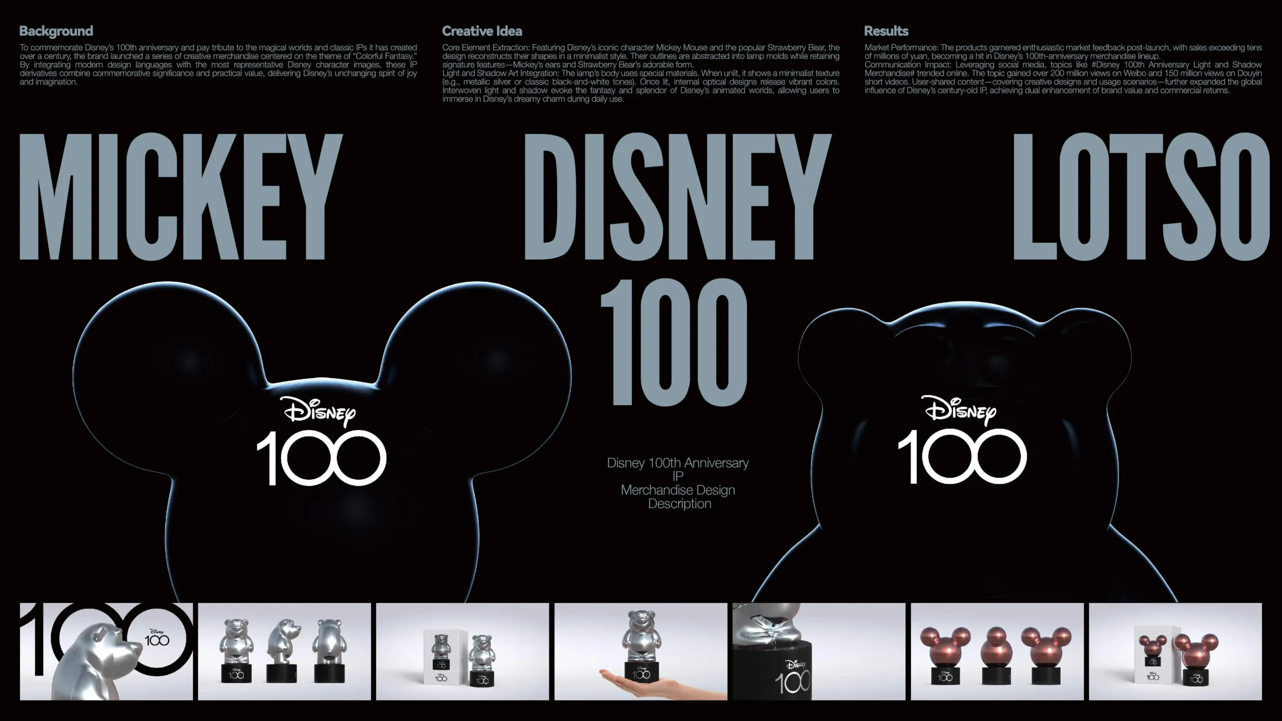 保持联系团队荣幸地受邀参与迪士尼100周年的纪念品研发设计工作。在此次设计中,我们精心挑选了代表迪士尼百年经典的米奇形象,以及深受大众喜爱的《玩具总动员3》中的草莓熊形象,巧妙地将它们融入灯具的外观设计之中。这一设计旨在通过米奇与草莓熊的结合,展现迪士尼百年传承的经典魅力与持续不断的创新精神之间的对话。同时,我们选择灯具作为载体,不仅因为其与迪士尼和影像之间的深厚渊源,更因为当灯光亮起时,那闪烁的熠熠星光仿佛能包容万物,将迪士尼的梦幻与缤纷展现得淋漓尽致。这款灯具不仅是一件纪念品,更是迪士尼百年辉煌与未来梦想的璀璨象征。