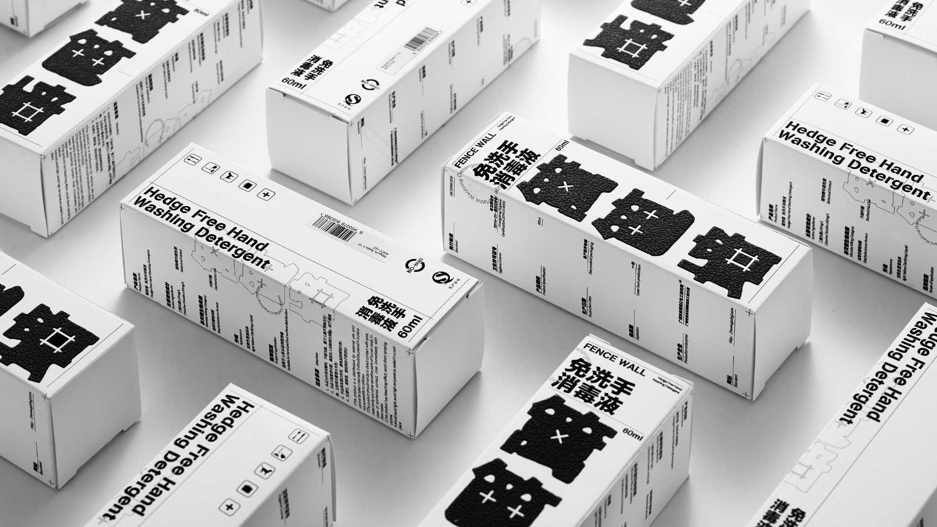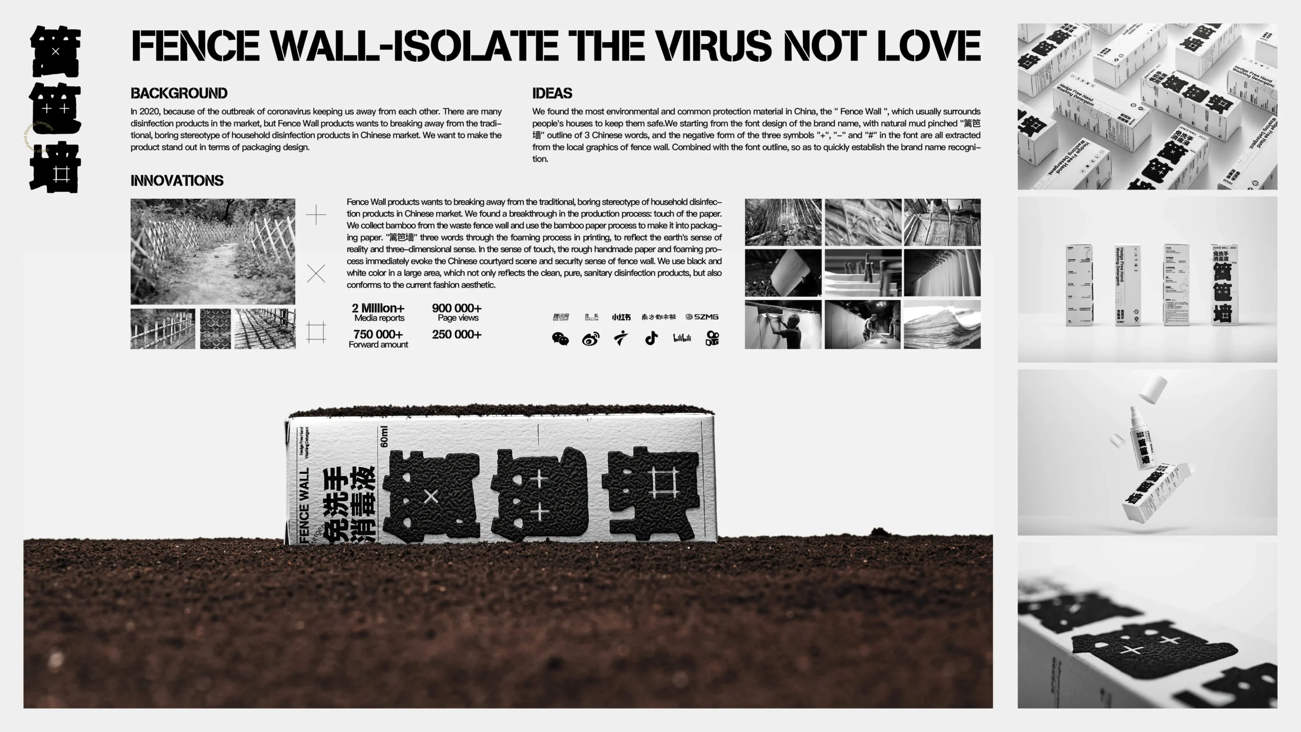 In 2020, because of the outbreak of coronavirus keeping us away from each other. There are many disinfection products in the market, but Fence Wall products wants to breaking away from the traditional, boring stereotype of household disinfection products in Chinese market. We want to make the product stand out in terms of packaging designWe found the most environmental and common protection material in China, the ” Fence Wall “, which usually surrounds people’s houses to keep them safe.We starting from the font design of the brand name, with natural mud pinched “篱笆墙” outline of 3 Chinese words, and the negative form of the three symbols “+”, “-” and “#” in the font are all extracted from the local graphics of fence wall. Combined with the font outline, so as to quickly establish the brand name recognition.Fence Wall products wants to breaking away from the traditional, boring stereotype of household disinfection products in Chinese market. We found a breakthrough in the production process: touch of the paper. We collect bamboo from the waste fence wall and use the bamboo paper process to make it into packaging paper. “篱笆墙” three words through the foaming process in printing, to reflect the earth’s sense of reality and three-dimensional sense. In the sense of touch, the rough handmade paper and foaming process immediately evoke the Chinese courtyard scene and security sense of fence wall. We use black and white color in a large area, which not only reflects the clean, pure, sanitary disinfection products, but also conforms to the current fashion aesthetic.