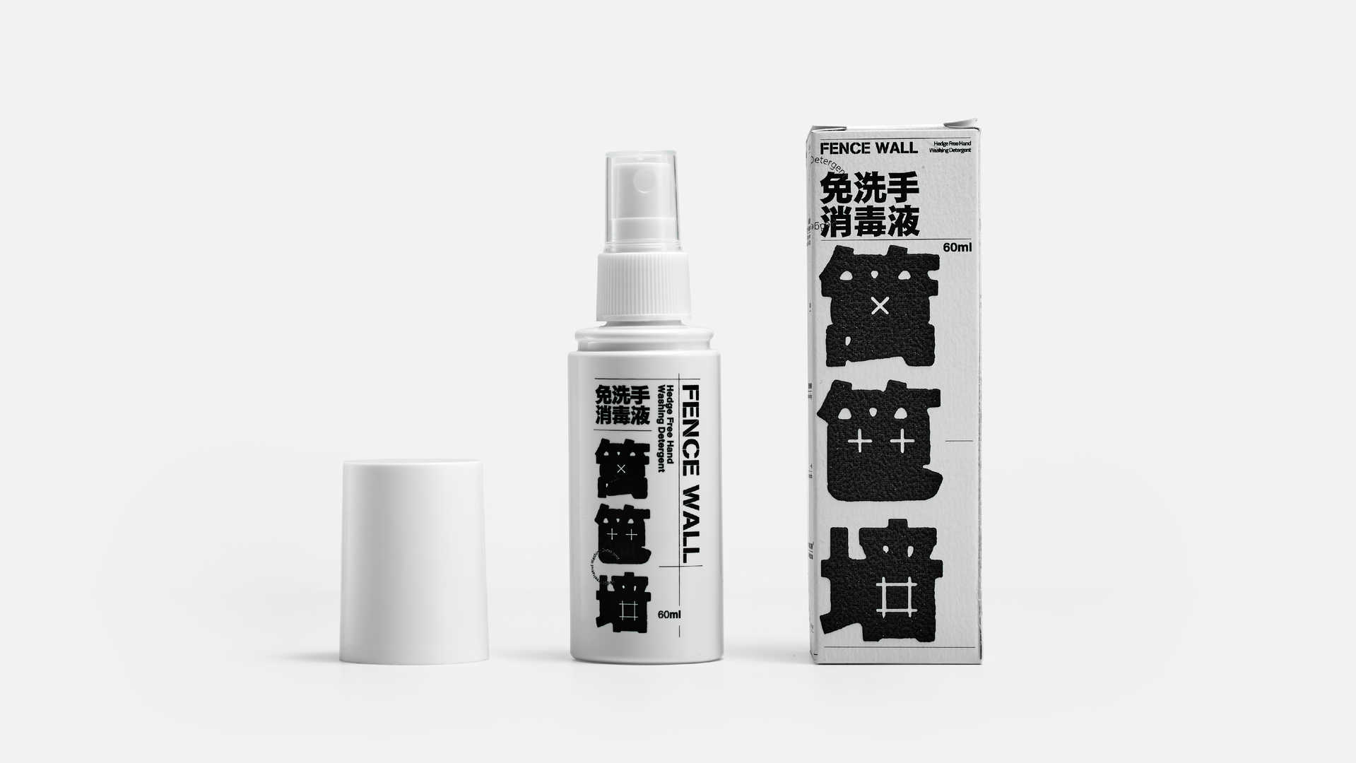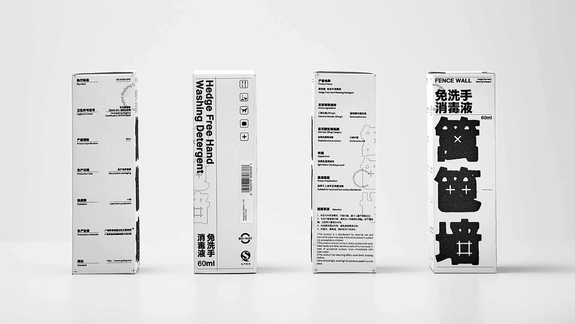 In 2020, because of the outbreak of coronavirus keeping us away from each other. There are many disinfection products in the market, but Fence Wall products wants to breaking away from the traditional, boring stereotype of household disinfection products in Chinese market. We want to make the product stand out in terms of packaging designWe found the most environmental and common protection material in China, the ” Fence Wall “, which usually surrounds people’s houses to keep them safe.We starting from the font design of the brand name, with natural mud pinched “篱笆墙” outline of 3 Chinese words, and the negative form of the three symbols “+”, “-” and “#” in the font are all extracted from the local graphics of fence wall. Combined with the font outline, so as to quickly establish the brand name recognition.Fence Wall products wants to breaking away from the traditional, boring stereotype of household disinfection products in Chinese market. We found a breakthrough in the production process: touch of the paper. We collect bamboo from the waste fence wall and use the bamboo paper process to make it into packaging paper. “篱笆墙” three words through the foaming process in printing, to reflect the earth’s sense of reality and three-dimensional sense. In the sense of touch, the rough handmade paper and foaming process immediately evoke the Chinese courtyard scene and security sense of fence wall. We use black and white color in a large area, which not only reflects the clean, pure, sanitary disinfection products, but also conforms to the current fashion aesthetic.