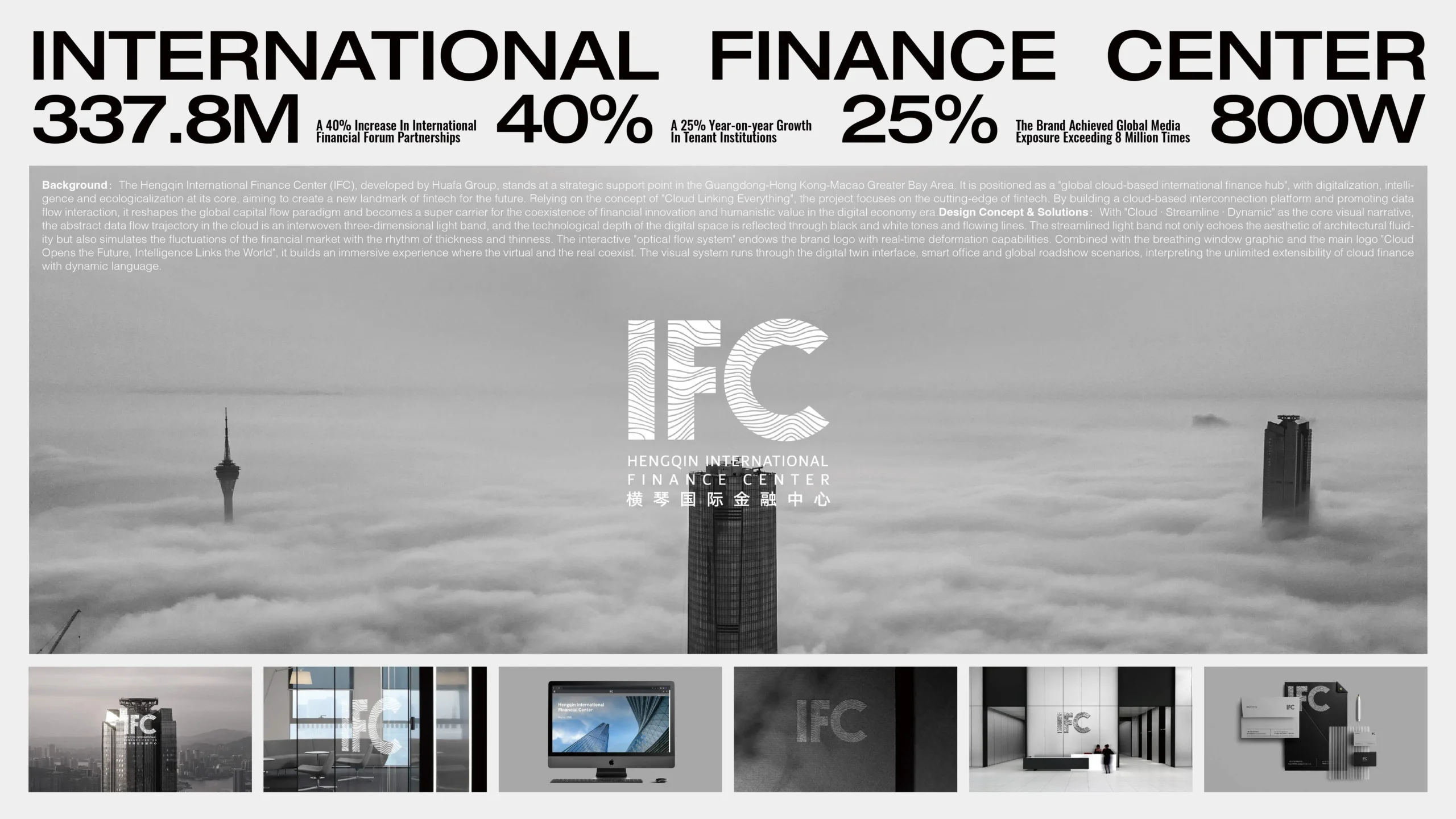 The Hengqin International Finance Center (IFC), developed by Huafa Group, stands at a strategic support point in the Guangdong-Hong Kong-Macao Greater Bay Area. It is positioned as a “global cloud-based international finance hub”, with digitalization, intelligence and ecologicalization at its core, aiming to create a new landmark of fintech for the future. Relying on the concept of “Cloud Linking Everything”, the project focuses on the cutting-edge of fintech. By building a cloud-based interconnection platform and promoting data flow interaction, it reshapes the global capital flow paradigm and becomes a super carrier for the coexistence of financial innovation and humanistic value in the digital economy era.With “Cloud · Streamline · Dynamic” as the core visual narrative, the abstract data flow trajectory in the cloud is an interwoven three-dimensional light band, and the technological depth of the digital space is reflected through black and white tones and flowing lines. The streamlined light band not only echoes the aesthetic of architectural fluidity but also simulates the fluctuations of the financial market with the rhythm of thickness and thinness. The interactive “optical flow system” endows the brand logo with real-time deformation capabilities. Combined with the breathing window graphic and the main logo “Cloud Opens the Future, Intelligence Links the World”, it builds an immersive experience where the virtual and the real coexist. The visual system runs through the digital twin interface, smart office and global roadshow scenarios, interpreting the unlimited extensibility of cloud finance with dynamic language.
