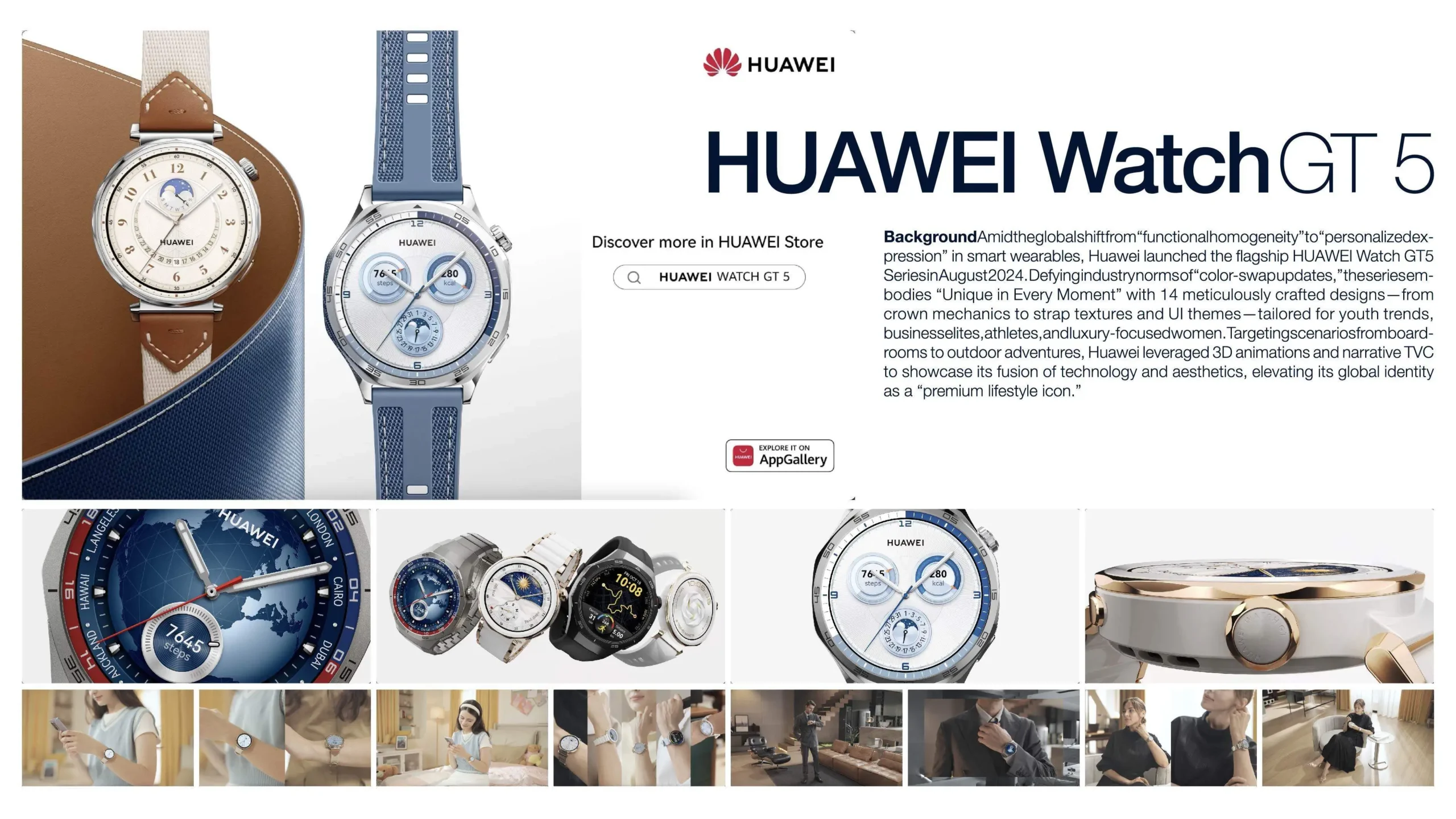 Amid the global shift from “functional homogeneity” to “personalized expression” in smart wearables, Huawei launched the flagship HUAWEI Watch GT5 Series in August 2024. Defying industry norms of “color-swap updates,” the series embodies “Unique in Every Moment” with 14 meticulously crafted designs—from crown mechanics to strap textures and UI themes—tailored for youth trends, business elites, athletes, and luxury-focused women. Targeting scenarios from boardrooms to outdoor adventures, Huawei leveraged 3D animations and narrative TVC to showcase its fusion of technology and aesthetics, elevating its global identity as a “premium lifestyle icon.”