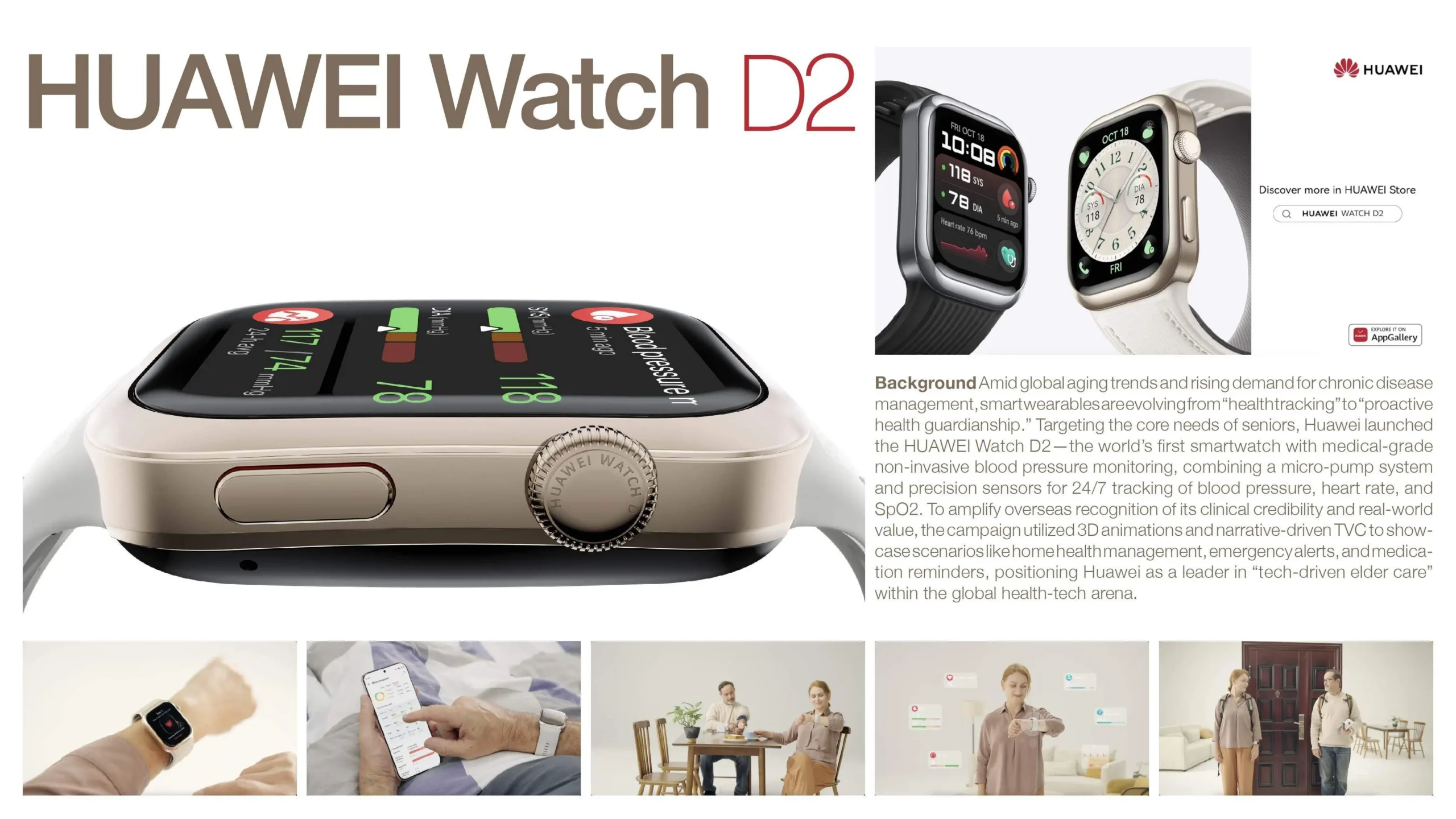 Amid global aging trends and rising demand for chronic disease management, smart wearables are evolving from “health tracking” to “proactive health guardianship.” Targeting the core needs of seniors, Huawei launched the HUAWEI Watch D2—the world’s first smartwatch with medical-grade non-invasive blood pressure monitoring, combining a micro-pump system and precision sensors for 24/7 tracking of blood pressure, heart rate, and SpO2. To amplify overseas recognition of its clinical credibility and real-world value, the campaign utilized 3D animations and narrative-driven TVC to showcase scenarios like home health management, emergency alerts, and medication reminders, positioning Huawei as a leader in “tech-driven elder care” within the global health-tech arena.
