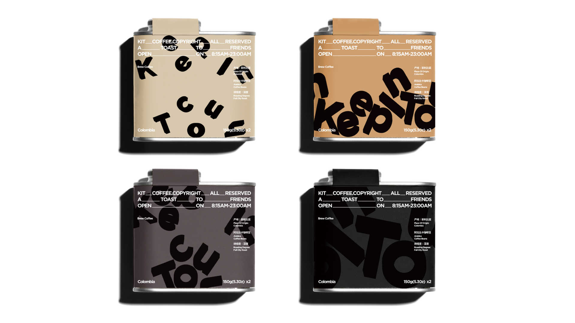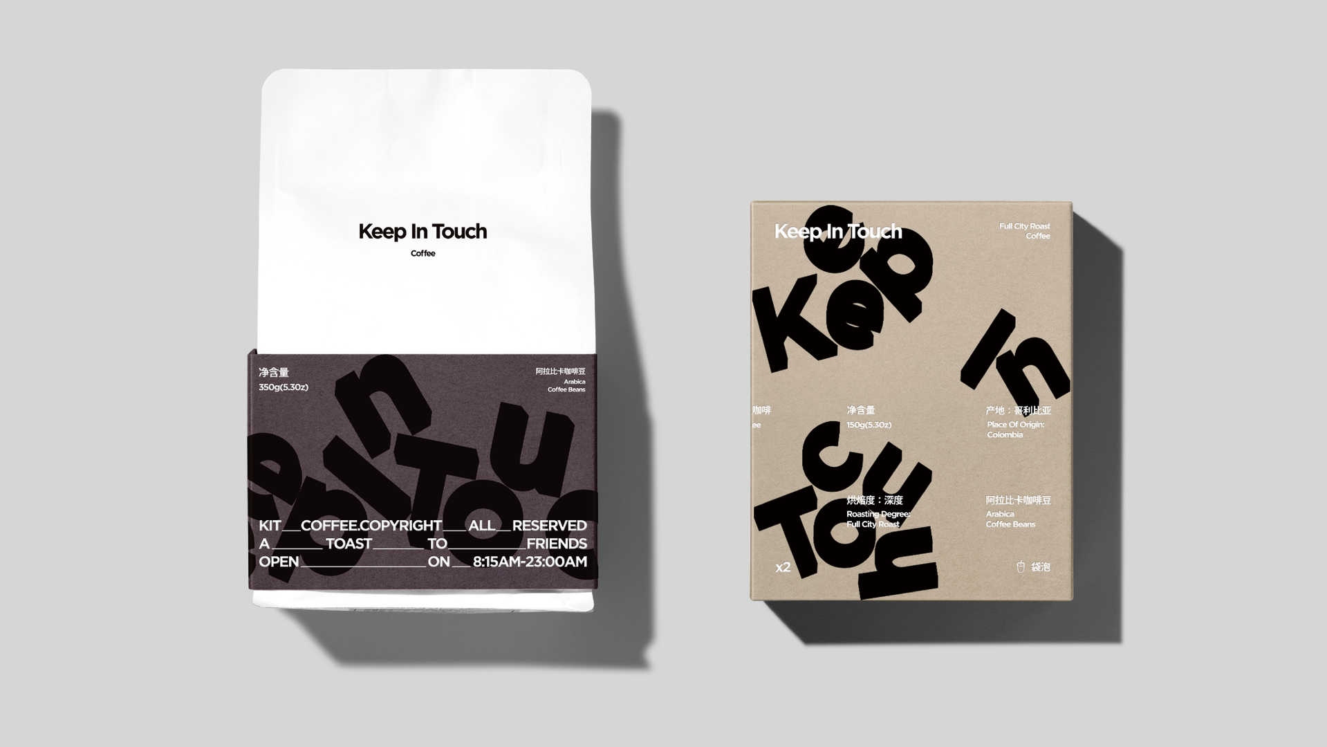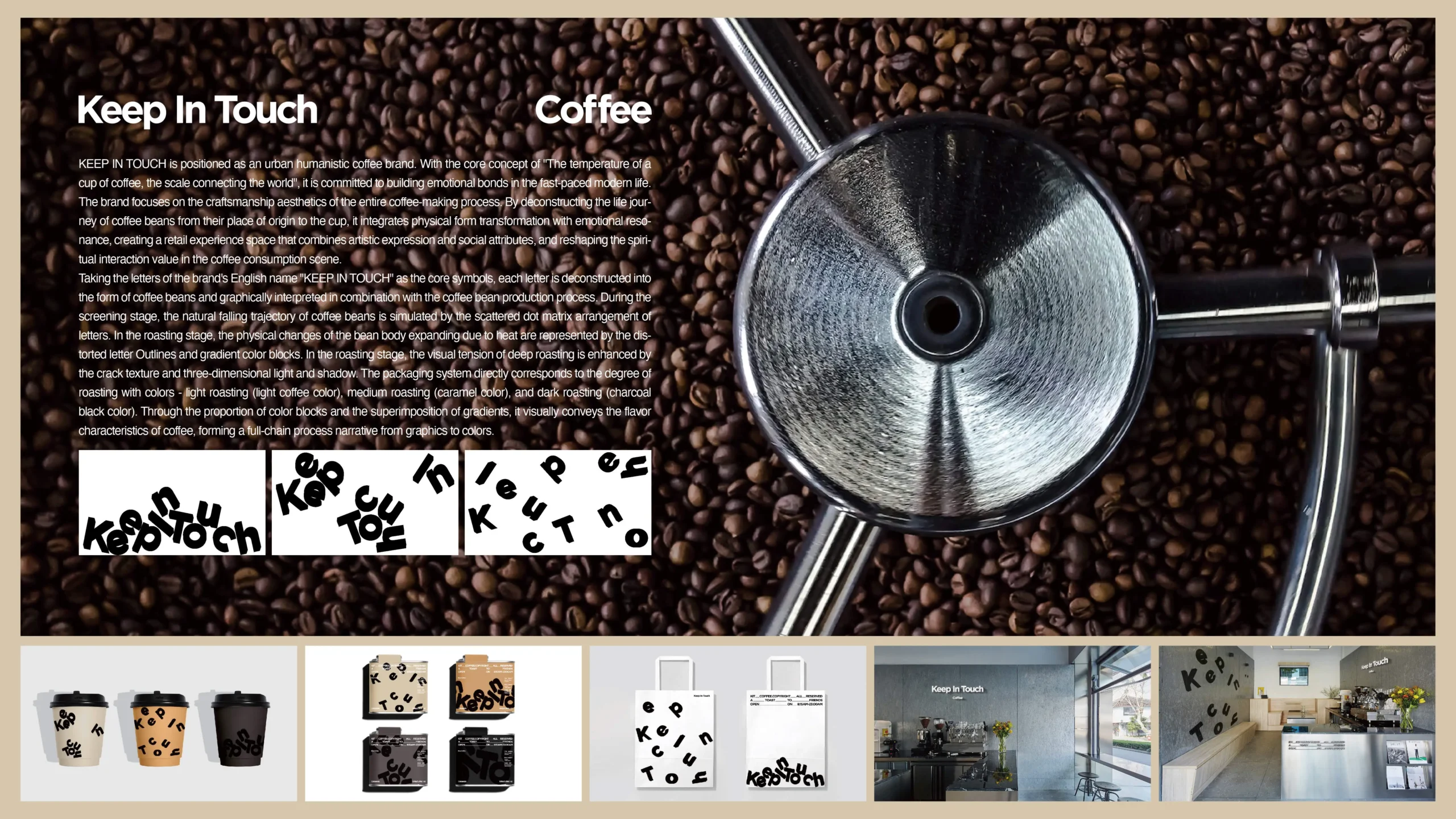 KEEP IN TOUCH is positioned as an urban humanistic coffee brand, with the core concept of “the temperature of a cup of coffee, the scale connecting the world”, committed to building emotional bonds in the fast-paced modern life. The brand focuses on the exquisite aesthetics of the entire coffee production process, deconstructing the life journey of coffee beans from their origin to the cup, integrating physical form transformation with emotional resonance, creating a retail experience space that combines artistic expression and social attributes, and reshaping the spiritual interactive value in coffee consumption scenes.Using the brand’s English name “KEEP IN TOUCH” as the core symbol, each letter is deconstructed into the shape of a coffee bean, and combined with the coffee bean making process for graphical interpretation: during the screening stage, a dot matrix arrangement of scattered letters is used to simulate the natural falling trajectory of coffee beans; During the frying stage, the physical changes of bean body thermal expansion are represented by distorted letter contours and gradient color blocks; During the baking stage, the use of crack texture and three-dimensional light and shadow enhances the visual tension of deep baking. The packaging system directly corresponds to the degree of roasting with colors – light roasting (light coffee color), medium roasting (caramel color), and deep roasting (charcoal black color). Through the proportion and gradient overlay of color blocks, the coffee flavor characteristics are intuitively conveyed, forming a full process narrative from graphics to colors.After the brand went online, the social media topic exposure exceeded 12 million times, and the store’s customer traffic increased by 65% year-on-year in the first month. The repurchase rate of customized coffee bean gift boxes reached 42%. User research shows that the recognition of the “letter coffee bean” symbol has reached 91%, and the perceived matching degree of the packaging color system accurately conveying baking differences has reached 87%, successfully shaping the brand mentality of “visible coffee aesthetics”.