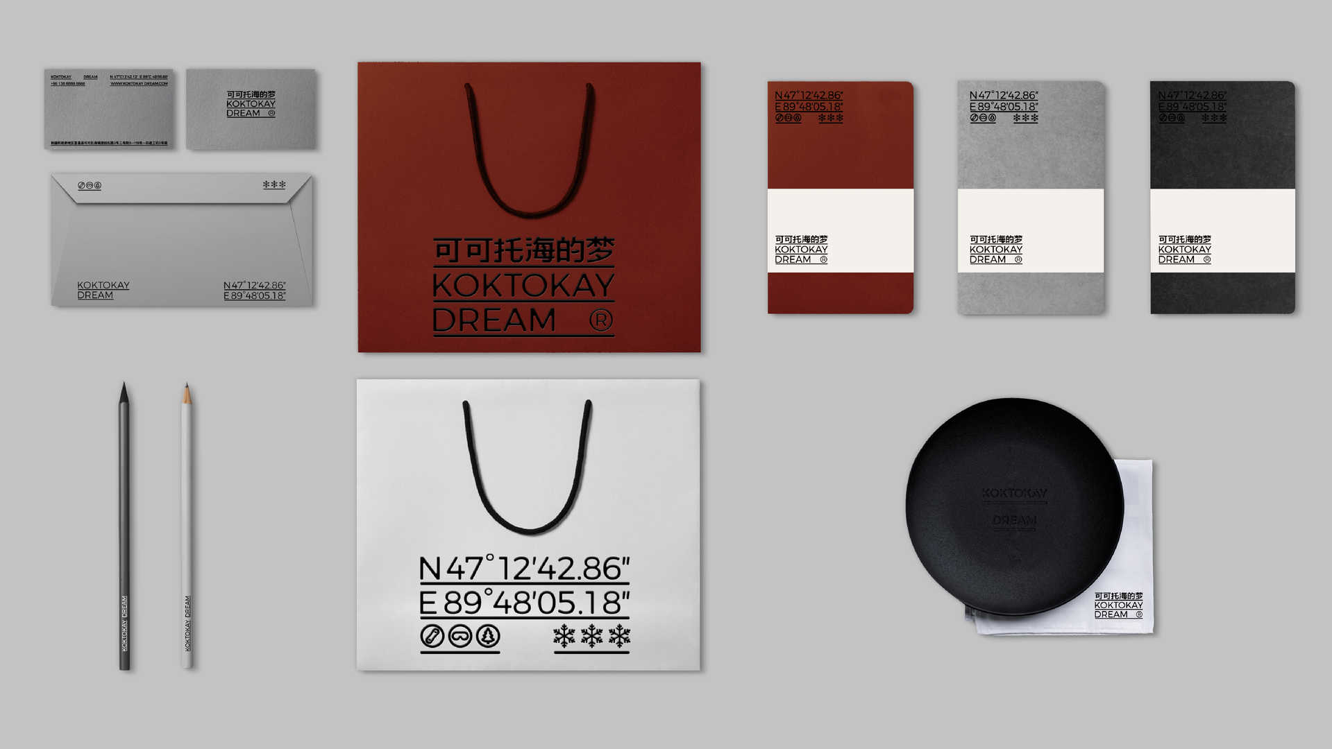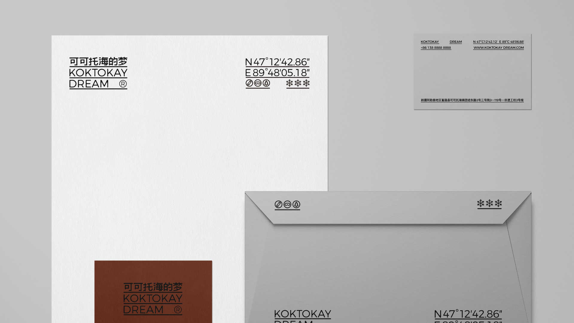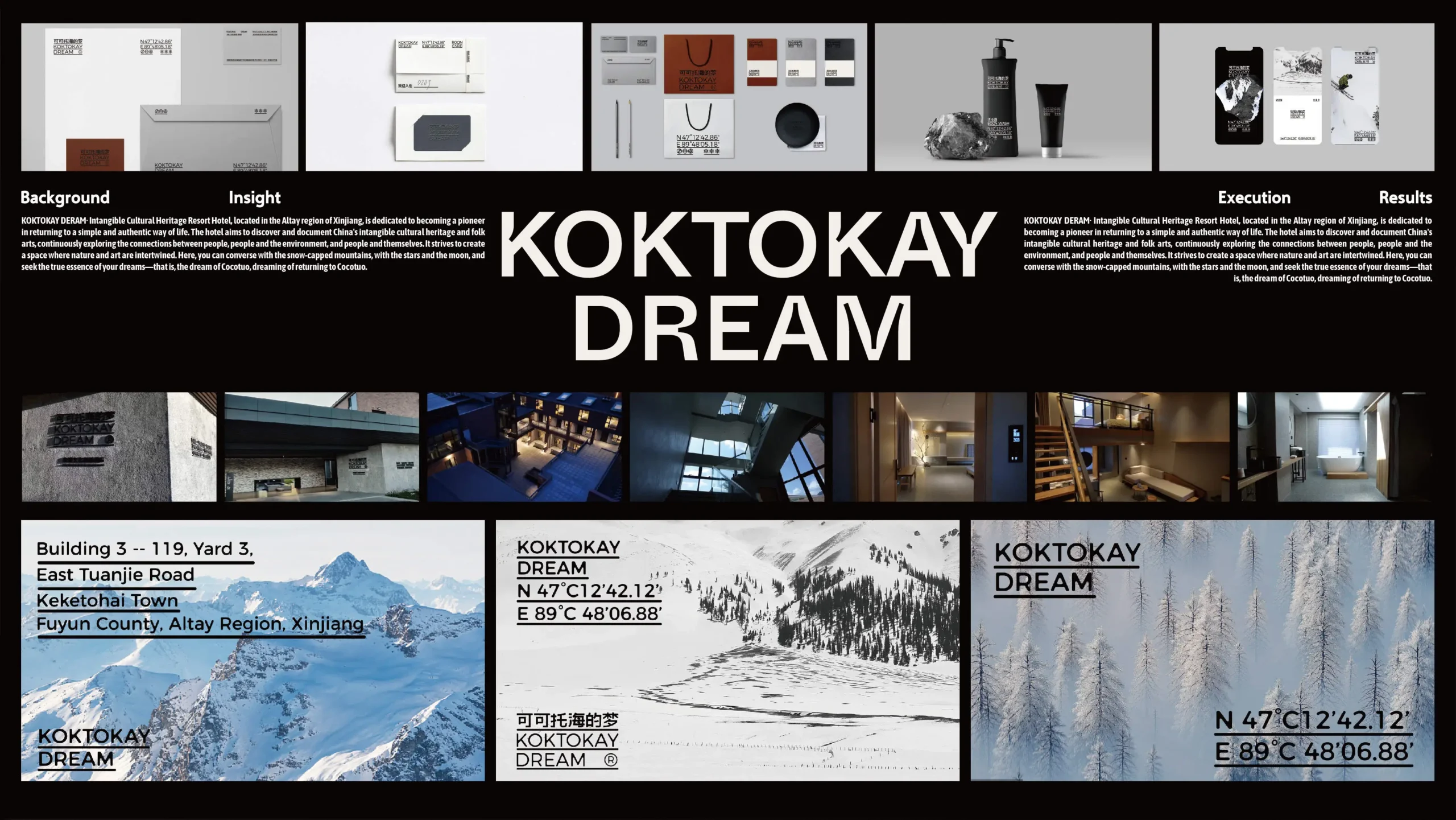 Keketuohai Hotel is located in Altay Prefecture, Xinjiang, with the core mission of protecting intangible cultural heritage and inheriting folk art. The project aims to create a travel and living space where nature and art blend, exploring the deep connection between people, the environment and the self. Relying on the unique snow-capped mountain scenery and starry sky resources of Keketuohai, the hotel advocates a return to a simple lifestyle and has become a spiritual haven for pursuing genuine dreams. By documenting and revitalizing cultural heritage, the hotel is committed to creating experience scenarios that combine ecological value with cultural depth.The creative solution for this design starts with the project name. The hotel’s project name is set as “Keketuohai’s Dream”, and the core design concept is “dissolution”, symbolizing the natural poetry of ice and snow melting and dreams flowing. Enhance brand memory points. The font adopts irregular gradient edges and a semi-transparent texture, simulating the visual dynamic of snow grains gradually melting under the sunlight. The faint light of stars and the moon is embedded between the strokes, echoing the brand concept of “Dialogue with the stars”. The main color tones are extracted from lacquer brick red, moonlight silver and rime white. The graphic symbols are integrated with the coordinates of longitude and latitude and the outline of glaciers, forming an organic symbiosis of cultural symbols and natural elements, and conveying the immersive aesthetic of “falling into a dream in the snow realm”. Selected as one of the “TOP10 Eco-Hotels in China”, it has become a new cultural and tourism landmark in Xinjiang and one of the 100 must-visit tourist destinations in a lifetime.