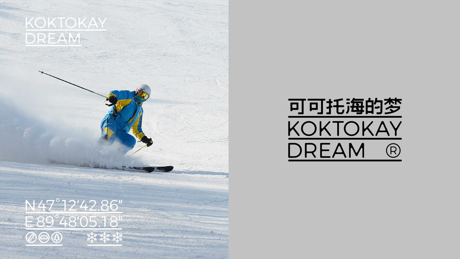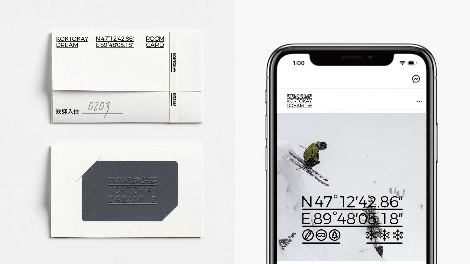 可可托海酒店位于新疆阿勒泰地区,以非物质文化遗产保护与民俗艺术传承为核心使命。项目旨在打造自然与艺术交融的旅居空间,探索人、环境与自我的深层连接。酒店依托可可托海独特的雪山景观与星空资源,倡导回归质朴生活方式,成为追寻本真梦想的精神栖息地。通过记录与活化文化遗产,酒店致力于构建兼具生态价值与文化深度的体验场景。此次设计的创意解决方案从案名开始,将酒店案名就定为可可托海的梦,并以“溶解”为核心设计理念,隐喻冰雪消融、梦境流动的自然诗意。增强品牌记忆点。字体采用不规则渐变边缘与半透明质感,模拟雪粒在阳光下渐次融化的视觉动态;笔画间嵌入星月微光,呼应“与星辰对话”的品牌理念。主色调提取漆砖红、月光银与雾凇白,图形符号融入经纬坐标与冰川轮廓,形成文化符号与自然元素的有机共生,传递“雪境入梦”的沉浸式美学。入选“中国生态酒店TOP10”成为新疆文旅新地标,入选一生必去的100大旅游目的地之一。