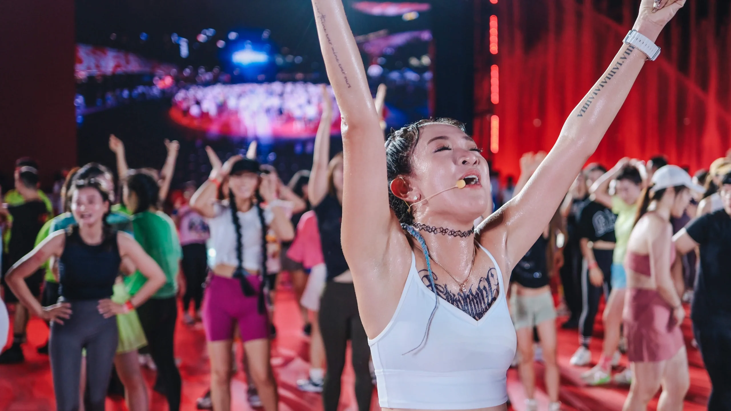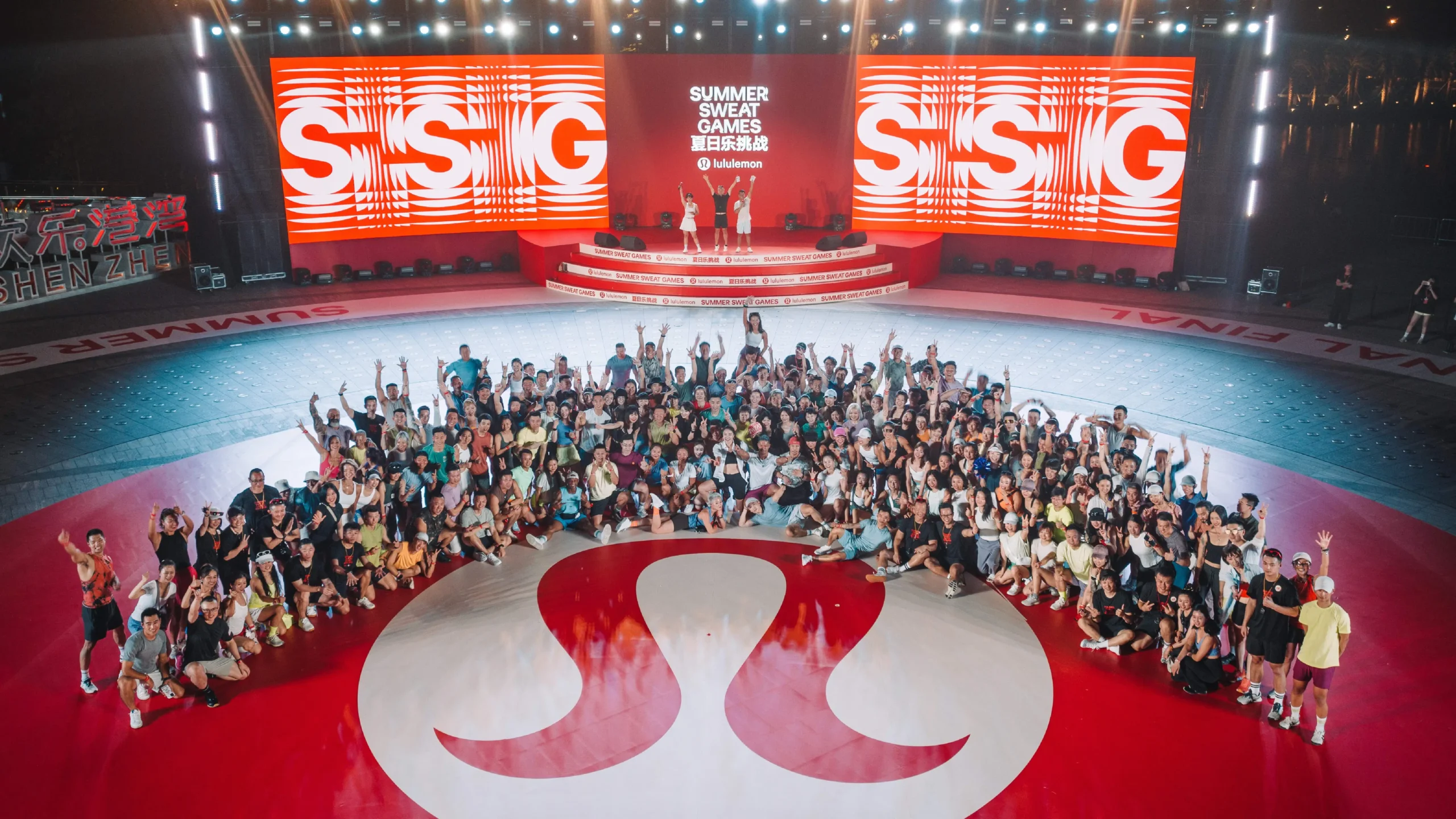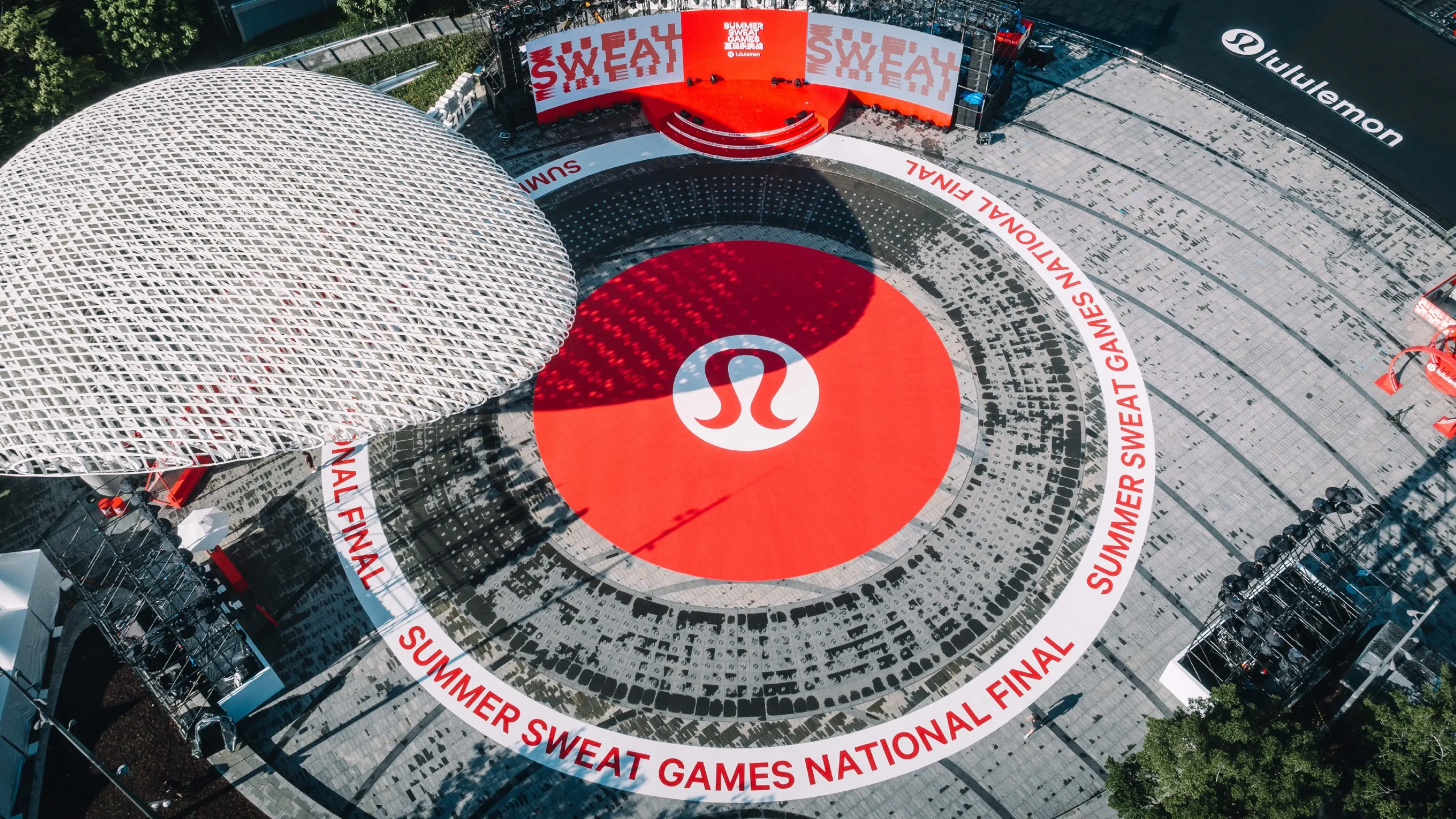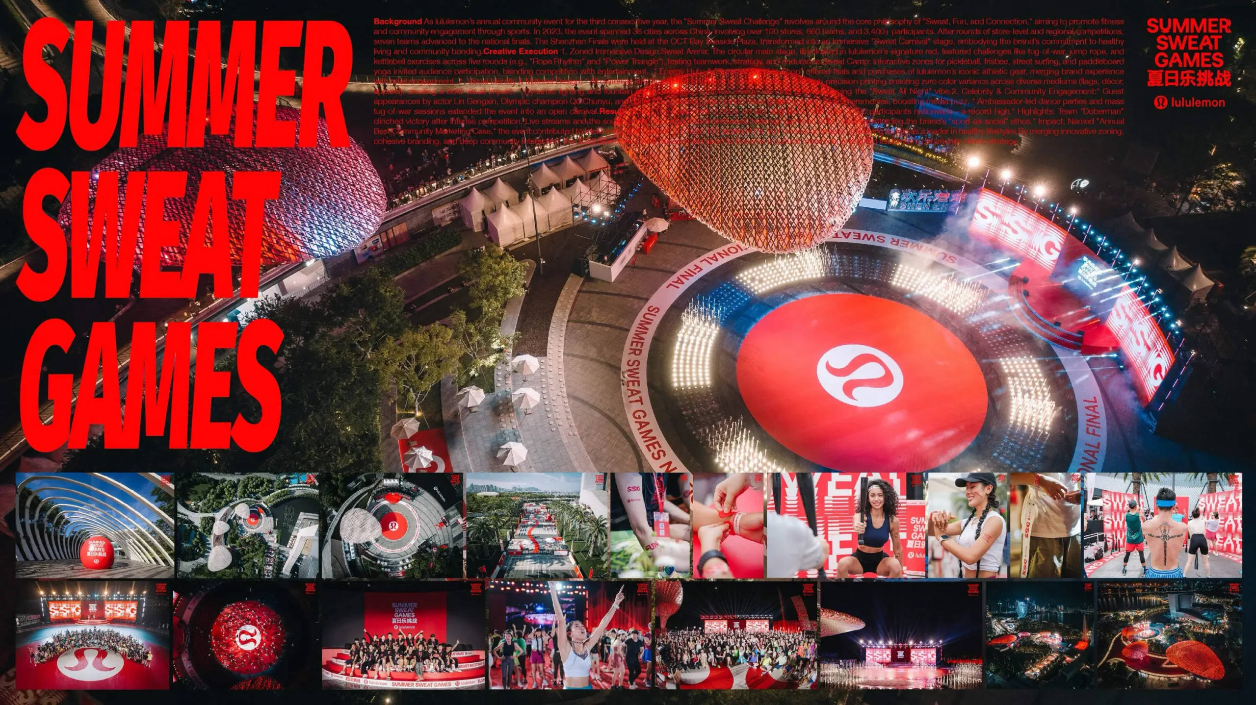 作为 lululemon 连续第三年举办的年度社区盛事,”夏日乐挑战”以“热汗、乐趣、联结”为核心理念,旨在通过运动赛事推动全民健身与社区互动。2023 年活动覆盖全国 36 座城市的 100 余家门店,吸引 860 支队伍、逾 3400 人参与,历经门店赛、区域赛层层选拔,最终7支队伍晋级全国总决赛。深圳华侨城欢乐港湾作为总决赛场地,被打造为”热汗狂欢日”的沉浸式舞台,呼应品牌倡导的健康生活方式与社群联结精神。活动创意:圆形主赛场以 lululemon 标志性红色点亮,设置拔河绳、跳绳、壶铃等道具,通过5轮综合挑战项目(如“绳彩飞扬””聚力三角”),考验团队体能、策略与默契。物料统一采用 lululemon 红色主色调,通过高精度印刷技术确保不同材质(如旗帜、装饰、服装)色彩零偏差,营造强烈的品牌视觉冲击力。动态灯光与喷泉水秀结合,夜间以红色光效呼应赛事激情,打造”热汗不眠夜”的狂欢氛围。