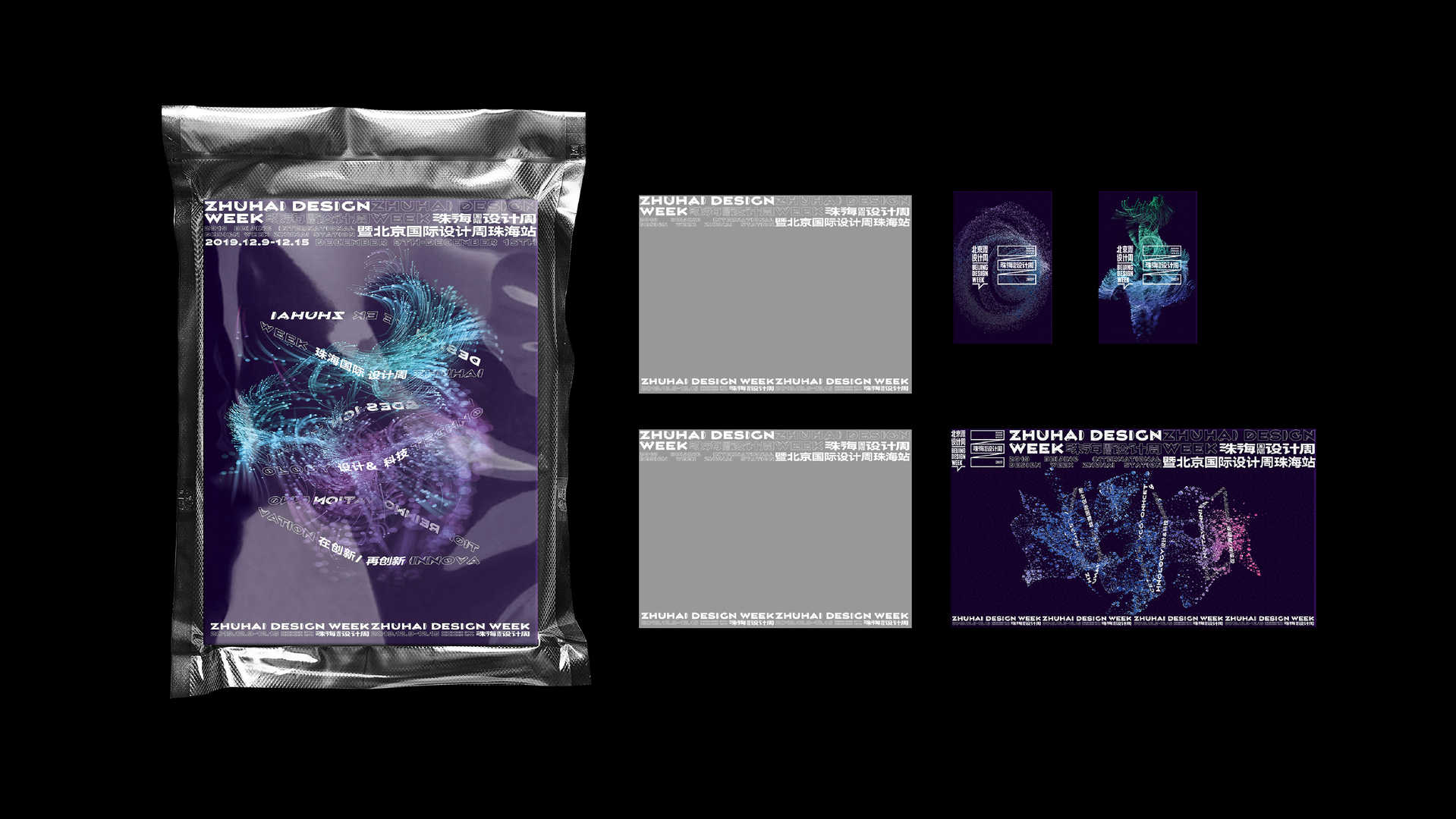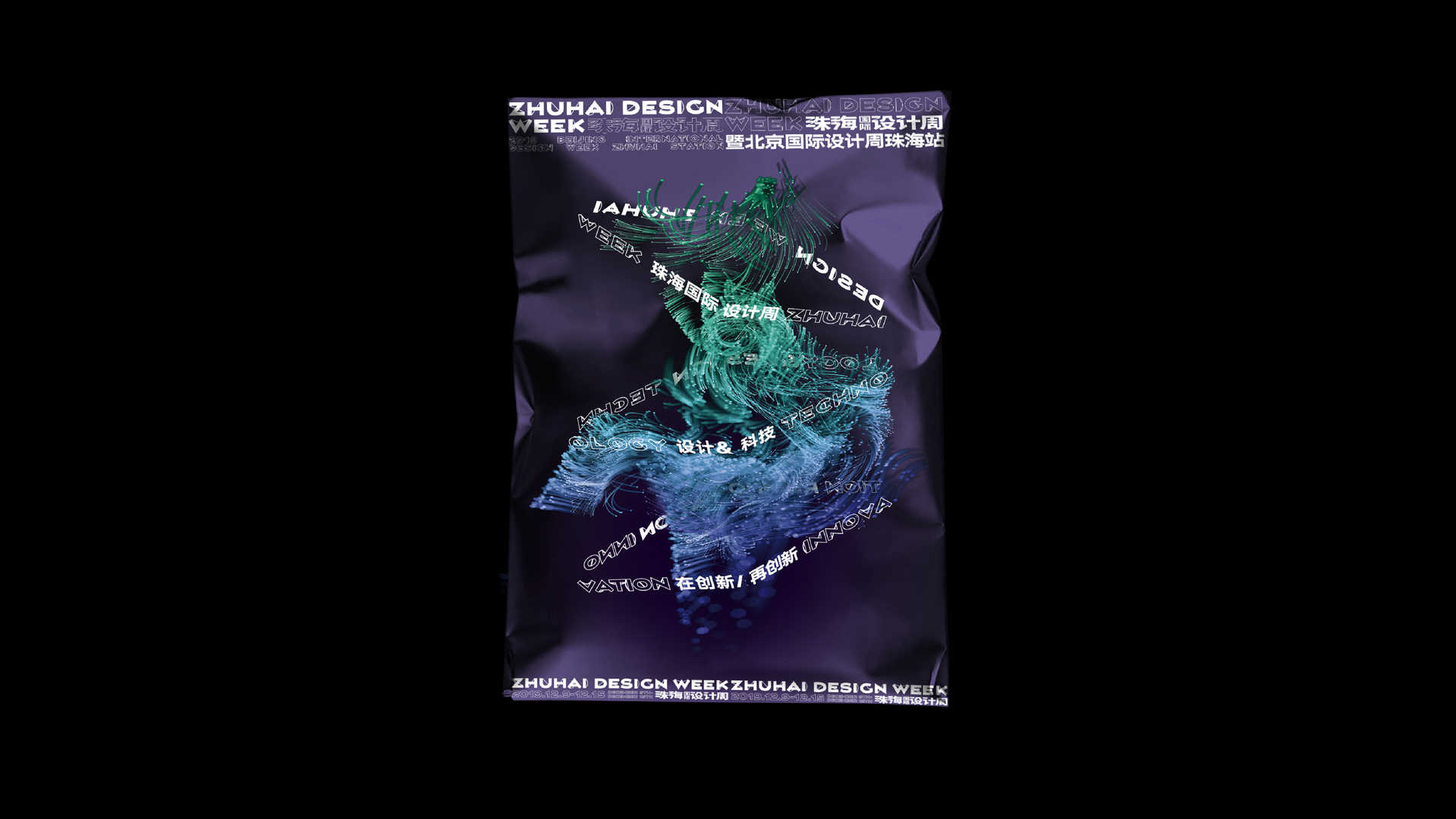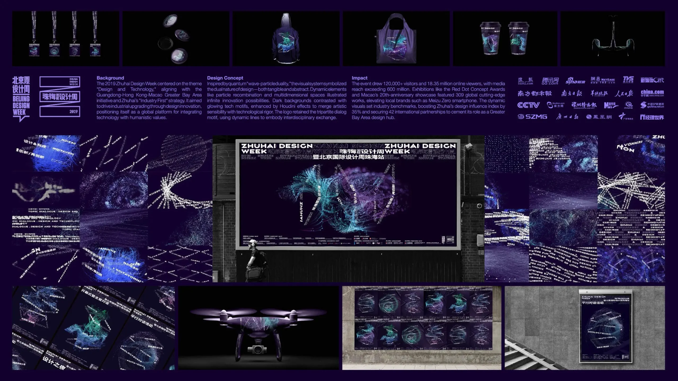 The 2019 Zhuhai International Design Week, with “Design and Technology” as its core theme, echoes the construction of the Guangdong-Hong Kong-Macao Greater Bay Area and Zhuhai’s strategic positioning of “industry first”, aiming to drive technological transformation and industrial upgrading through design innovation. As an international city card of Zhuhai, the Design Week focuses on the integration of “humanity” and “technology”, promoting the aggregation of design resources and the construction of an innovative ecosystem in the bay Area, and creating a design exchange platform for the future.The main visual design is inspired by the “wave-particle duality” of quantum mechanics, metaphorically suggesting that the dual attributes of design and technology are both concrete and abstract, rational and emotional. Dynamic visuals symbolize the infinite possibilities of design innovation through particle flipping, recombination and multi-dimensional space extension. The contrast between the dark background and the light of technology reinforces the theme of “exploring the future”.Houdini special effects technology achieves a visual integration of artistic sensibility and technological rationality. The logo continues the three-part dialogue box, connecting elements with dynamic lines, embodying the concept of cross-disciplinary dialogue and innovative interaction, and echoing the core proposition of “design empowering technology”.