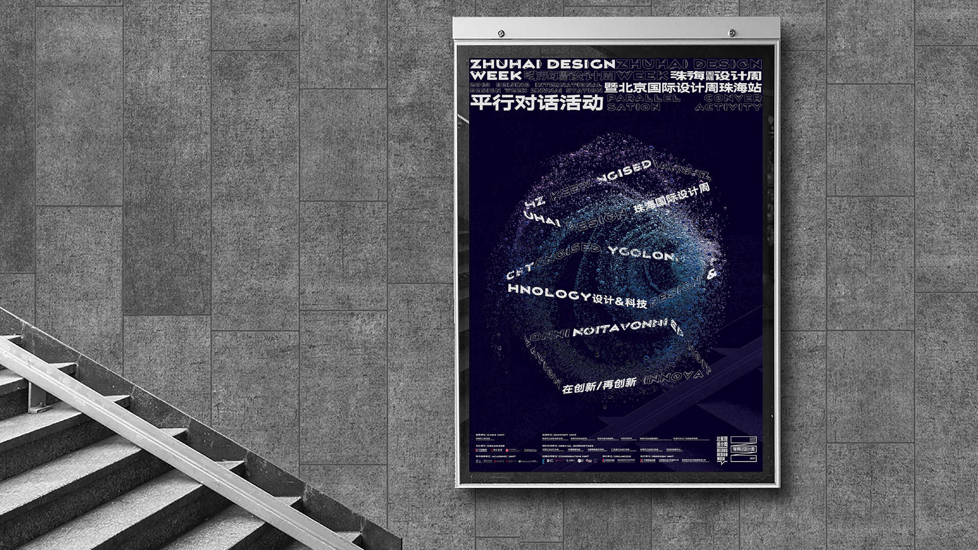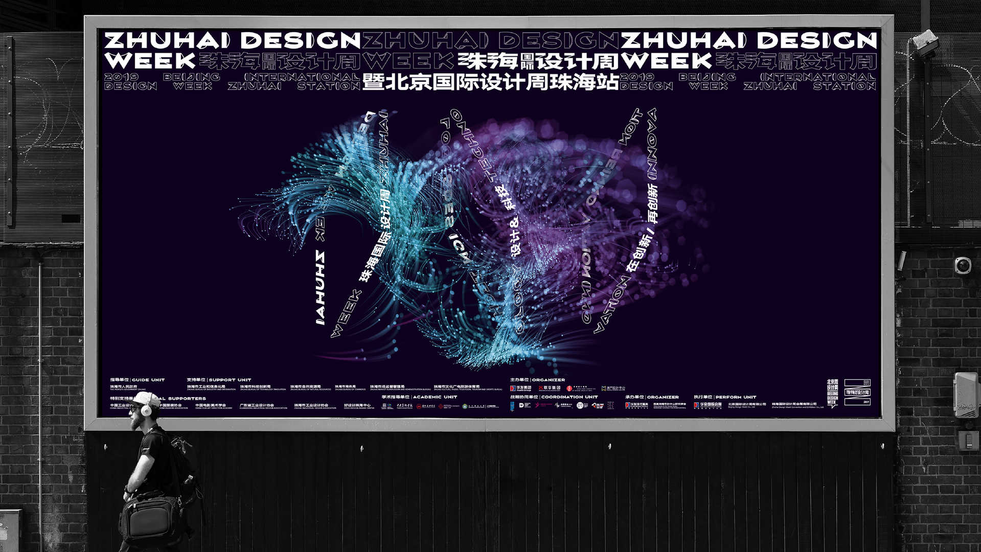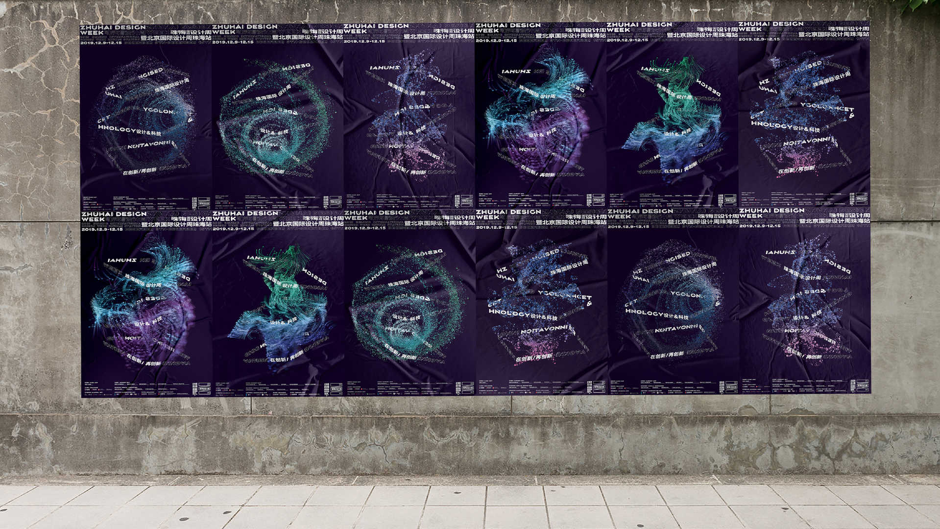 The 2019 Zhuhai International Design Week, with “Design and Technology” as its core theme, echoes the construction of the Guangdong-Hong Kong-Macao Greater Bay Area and Zhuhai’s strategic positioning of “industry first”, aiming to drive technological transformation and industrial upgrading through design innovation. As an international city card of Zhuhai, the Design Week focuses on the integration of “humanity” and “technology”, promoting the aggregation of design resources and the construction of an innovative ecosystem in the bay Area, and creating a design exchange platform for the future.The main visual design is inspired by the “wave-particle duality” of quantum mechanics, metaphorically suggesting that the dual attributes of design and technology are both concrete and abstract, rational and emotional. Dynamic visuals symbolize the infinite possibilities of design innovation through particle flipping, recombination and multi-dimensional space extension. The contrast between the dark background and the light of technology reinforces the theme of “exploring the future”.Houdini special effects technology achieves a visual integration of artistic sensibility and technological rationality. The logo continues the three-part dialogue box, connecting elements with dynamic lines, embodying the concept of cross-disciplinary dialogue and innovative interaction, and echoing the core proposition of “design empowering technology”.
